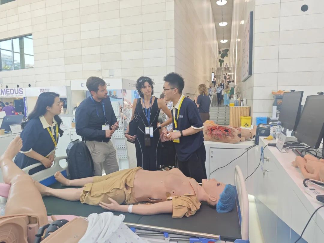 Doctors from a national hospital in Southeast Asia gathered around NUWA-Birthing Simulator, experiencing the simulation of childbirth processes and learning about AI-adjusted physiological parameter functions. Professionals worldwide experienced the full process of emergency rescue scenario training by MULAN-Multifunction Patient Simulator. Visitors engaged in hands-on experiences of palpation and auscultation of SP Brothers-Standardized Patient Brothers, understanding how to enhance clinical thinking skills in practice. Many visitors on-site expressed that these products would greatly enhance the efficiency of medical teaching and training.